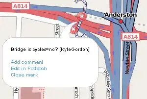 OpenStreetBugs help you to mark errors in OSM data. You can leave a short message on the map if something is missing or obviously wrong, like "oneway in wrong direction" or "bridge or level_crossing?". Someone will go there and check this. | |