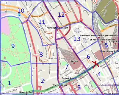 Transport for London Zone 1. Mainline trains to the north, and various tube lines.