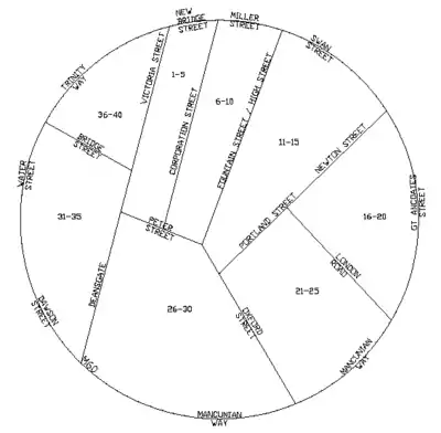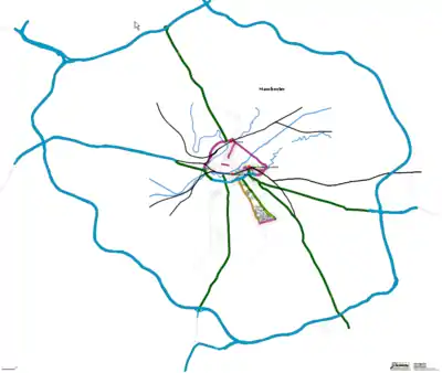 The above schematic drawings break down Manchester into a set of logical sectors. Each sector is bounded by major or prominent highways. There are three rings identified within the M60 orbital motorway. A nicer version woth the OSM logo can be downloaded here (4MB)