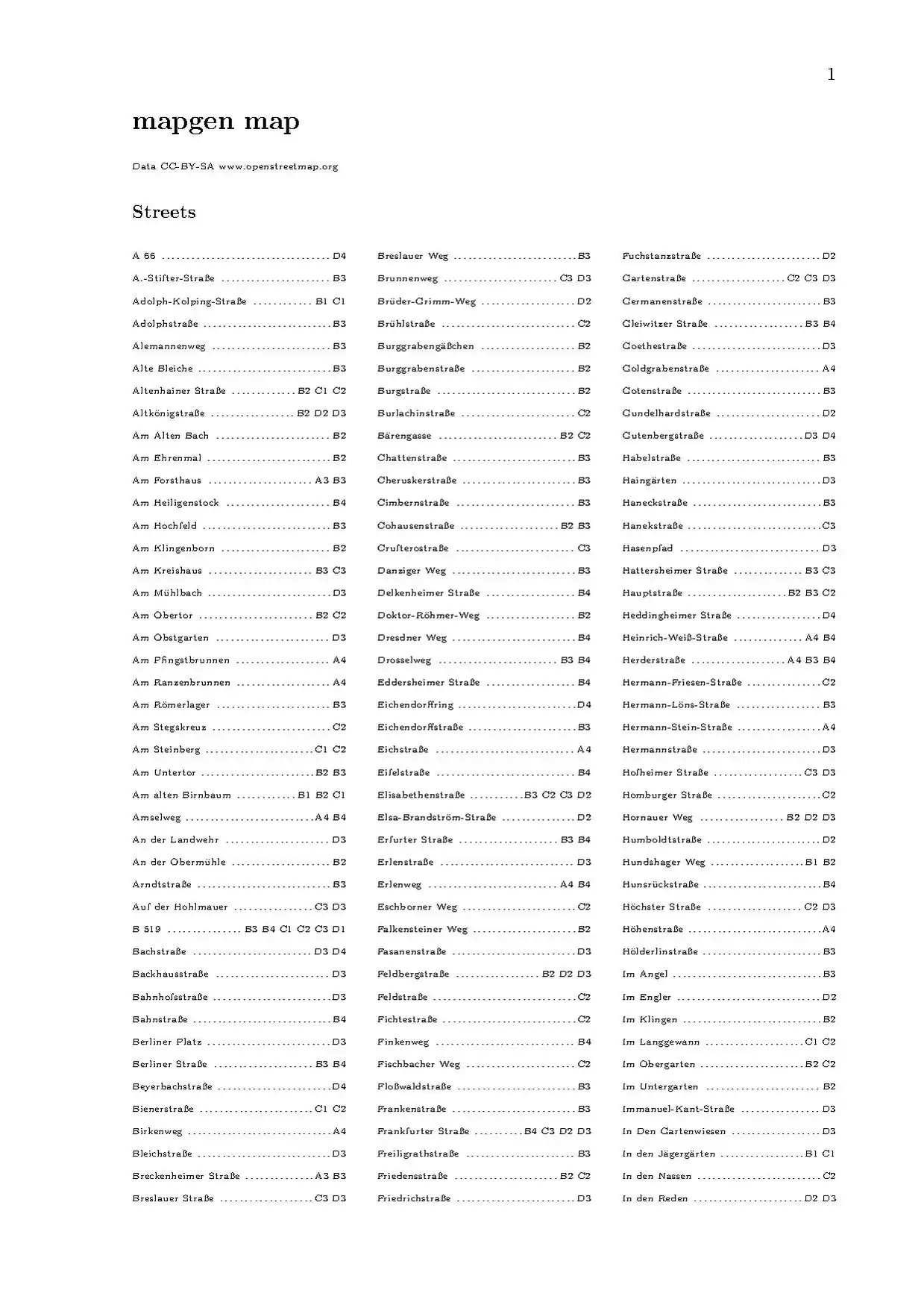 - Another option is to automatically create a street and/or POI directory (with grid reference); also formatted in PDF (via latex, dvips and ps2pdf - automatically.
