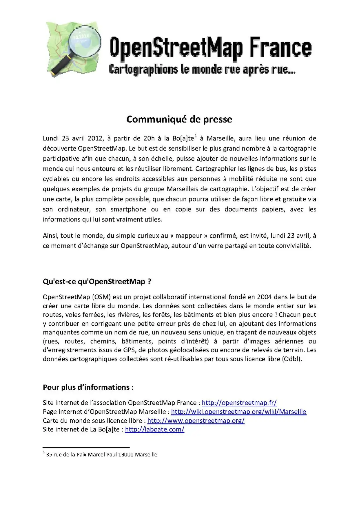 Nous avons eu la visite de Thierry Kressmann, porteur du projet Echelle 1 avec Guillaume Monsaingeon dans le cadre de MP2013. Ils cherchent d'une part des personnes prêtes à s'investir dans leur projet comme méditateur cartographique et d'autre part une solution pour conserver une trace des évènements et réalisations qu'ils organiseront pendans l'année capitale. Sur le 1er point, il nous enverra un texte d'une dizaine de ligne à transmettre sur la mailing list. Pour le 2nd point, la nature éphémère des installations/évènements les rendent difficilement compatibles avec la base de données OpenStreetMap mais il est possible de déployer une infrastructure similaire pour recueillir ces données.