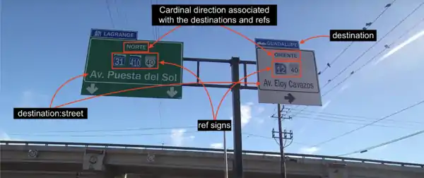 These are some examples, based on the above image from Monterrey, of tags that can be used to precisely reflect destinations and refs seen on signposts. For more examples please go to the destination=* page.