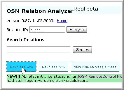 Um die gpx-Datei herunterzuladen gehen sie auf den Link "Check" des jeweiligen Verlaufes (Relation). Hier finden sie auf der linken oberen Seite folgenden Button: