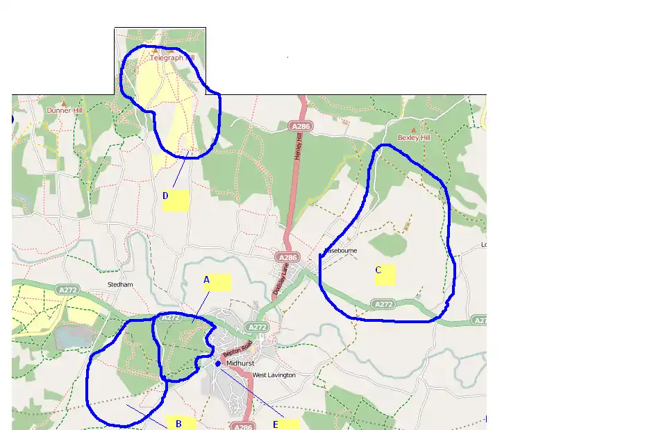 - A - Midhurst Common: Fairly wooded area just outside the town. Dense network of official rights of way and permissive paths. Tree cover can affect signal. Needs patience! Estimated time to complete: 4 to 6 hours.