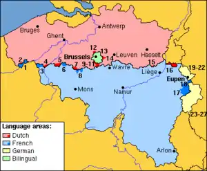 The municipalities with language facilities in Belgium, shaded darker. All of the German area has language facilities. 1. Comines-Warneton 2. Mesen 3. Mouscron 4. Spiere-Helkijn 5. Ronse 6. Flobecq 7. Bever 8. Enghien 9. Drogenbos 10. Linkebeek 11. Sint-Genesius-Rode 12. Wemmel 13. Kraainem 14. Wezembeek-Oppem 15. Herstappe 16. Voeren 17. Malmedy 18. Waimes 19. Lontzen 20. Raeren 21. Eupen 22. Kelmis 23. Burg-Reuland 24. Sankt Vith 25. Amel 26. Bütgenbach 27. Büllingen[1]