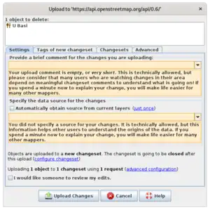 Indien u één bewerking hebt voltooid en met iets anders begint, zorg er dan voor dat dat "iets anders" wordt opgenomen in een afzonderlijke wijzigingenset, met zijn eigen toepasselijke opmerking voor wijzigingenset. Potlatch past standaard uw bewerkingen toe op een bestaande wijzigingenset, maar u kunt "C" typen om de huidige wijzigingenset te sluiten. JOSM maakt standaard een nieuwe wijzigingenset voor elke upload, maar u kunt die instelling wijzigen in het dialoogvenster voor uploaden.