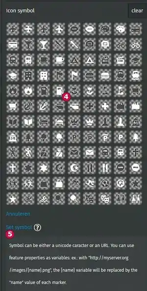 Met Icon symbol kan het symbooltje in de Standaard en Drop vormen gekozen worden. Het eenvoudigste is om uit de tabel bij 4 een symbool te kiezen.