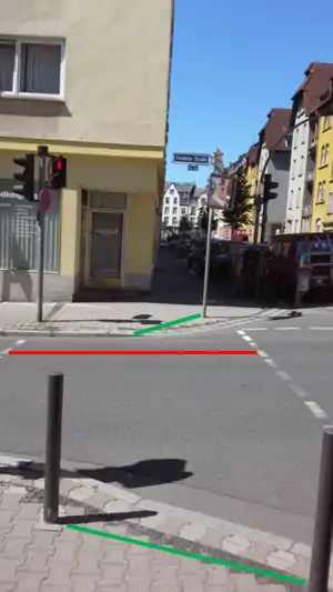 - Die rote Linie gibt die Breite der Straßenquerung an - allerdings ist diese Breite nicht zu vermessen.