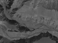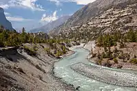 ![]() Confluence of Marsyagdi and Jharsang Khola, Annapurna Himal. Situated on the Annapurna Circuit trek upstream of Manang. The path can just be made out on far right leading down to the suspension bridge over the Jharsang Khola. |