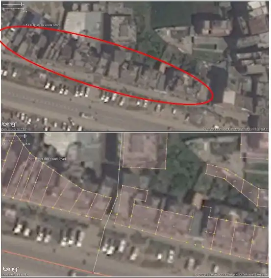 Below we see part of the building is covered by the shadow of another building. In this case you have to reference the other edges of the building and digitize accordingly.