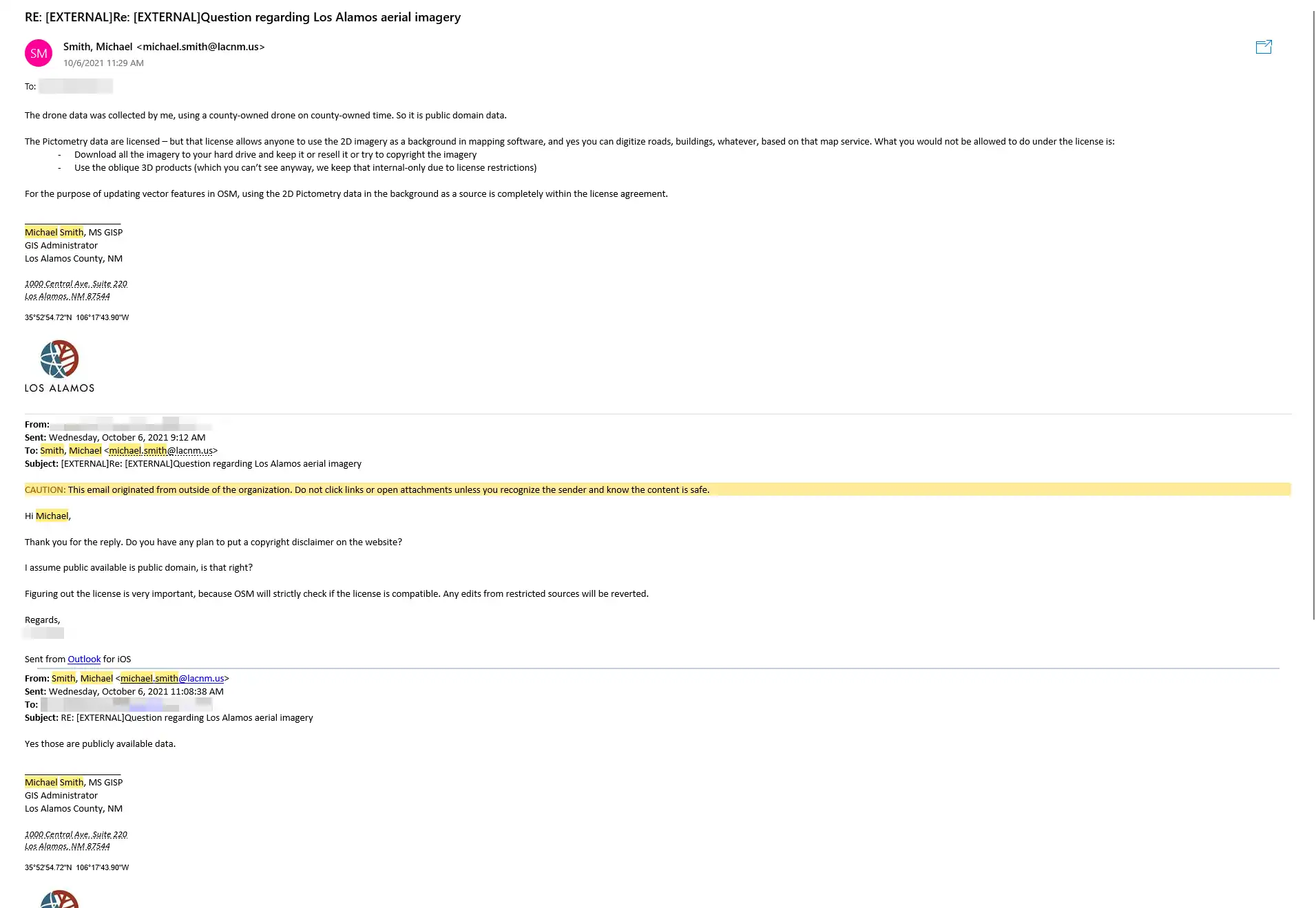 Los Alamos County GIS Administrator Michael Smith has approved the imagery usage in OpenStreetMap as public domain data. A proof has been obtained and uploaded to the OpenStreetMap Wiki.