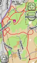 Litt lettere å se langrennsløypene enn på OpenSnowMap pga. fargen, men skiller ikke mellom løypene for skøyting, klassisk etc. |