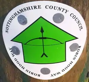 The waymark for this trail is a green or yellow bow and arrow on a white background, but it can be difficult to follow as many of the signs are old and faded. Start point is shown on a plaque embedded in the wall just outside the entrance to Nottingham Castle. | 1652131 |