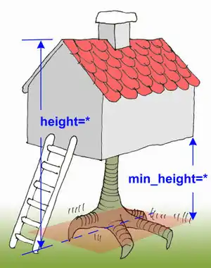 | height=* | Distance between the lowest possible position with ground contact and the top of the roof of the building, excluding antennas, spires and other equipment mounted on the roof. |