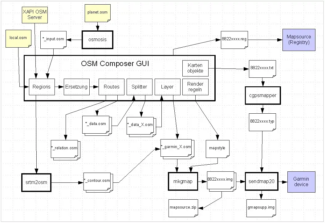 OSM Composer is a Java GUI to create up-to-date topological maps. The current version generates maps for Garmin devices with custom map features. Composer is intended to simplify/automate the steps of creating topo maps with the latest data for selected regions. The idea is to define your areas of interest (home town, mapping area, hiking tours, frequently visited places) and transfer only that data to your device instead of whole continents. But these areas of interest should be done with the latest data - including your own recent editings uploaded 10 minutes ago - and displayed exactly in the way you like it, customized for your favourite pastimes. To this end it contains an editor for customizing the mapping instructions of mkgmap and a TYP file for your device in one integrated tool. It can also do some additional transformations on the OSM data. Once everything is set up, you just press "Generate" and watch Map Composer do all the work.
