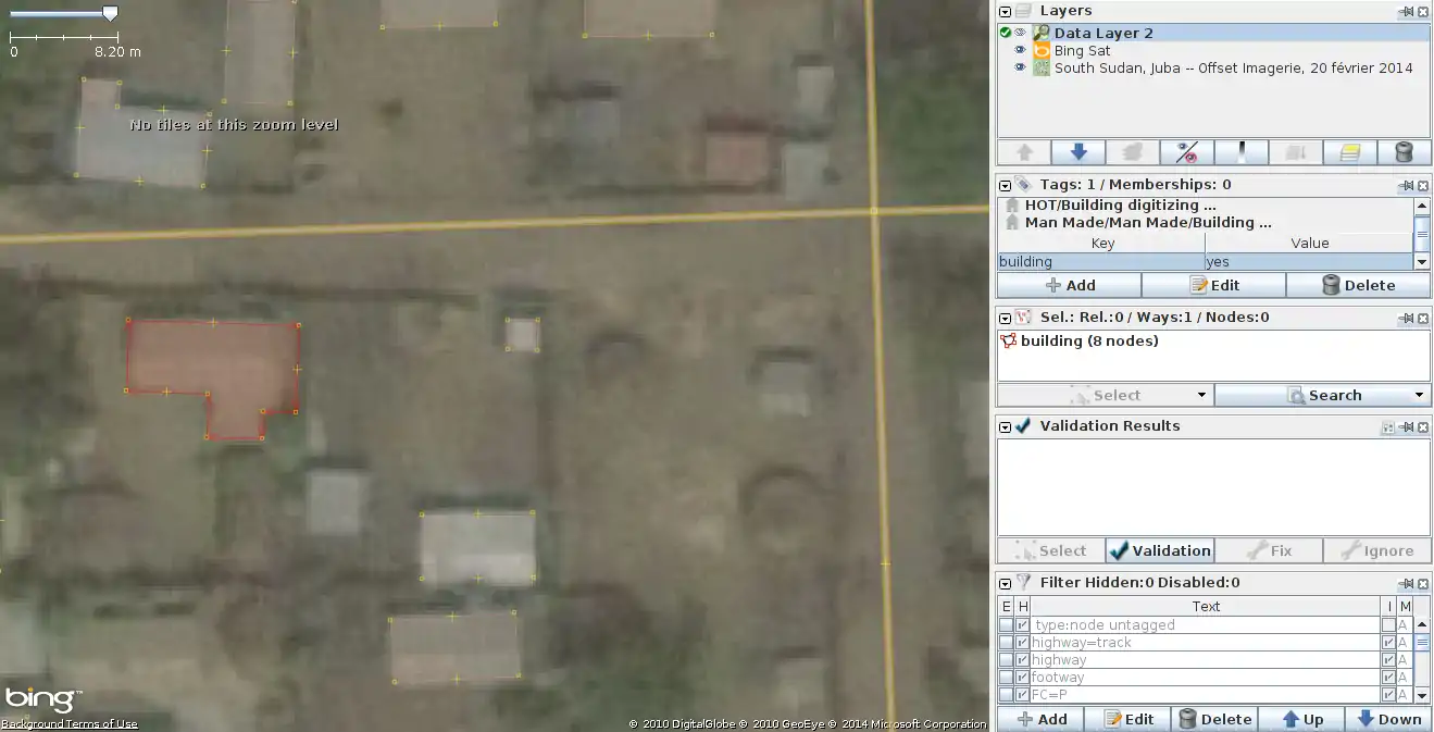 . If there are none under a 1 km range you should create one for this area. - Find, preferentially in the central area of the task, a distinct object on the Bing imagery, eg a building angle but not too high to avoid the inclination issues. In theory, the object should on the ground level and have no height, but it is often tricky to find such object (like a street crossing) in developing countries.