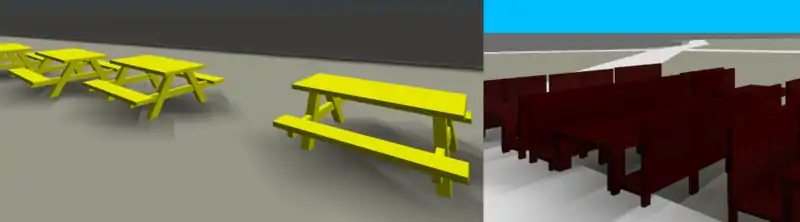 OLD: An student from the Rapperswil branched OSM2WORLD and implemented amenity=="table". I also got the code extensions and adapted them to Javascript and OSM go. The cool thing is: sizes, numbers of chairs and colors are calculated from given OSM-Tags. There is a lot of geometry transforming and rotating. So I made an class/library to handle parts of node-objects and implemented some more types: