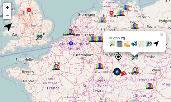 - Layer “You” will get active, if you klick on the “location” control at bottom left. Your browser will ask you to use your actual location, show an icon and will zoom to it. Also the location, determined by your IP address will be shown.