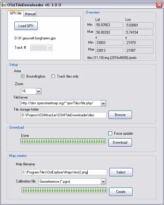 OSM tile downloader is a Windows application for downloading OSM tiles from an area defined by a GPX track. Also tile stitching to make a large map for Ozi Explorer or other programs is possible.