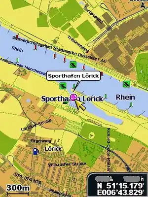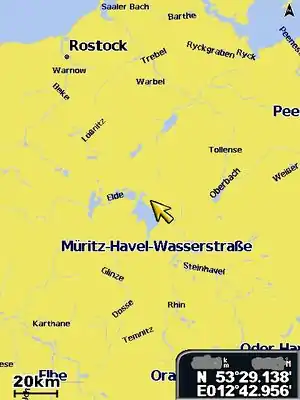 When zooming out, the streets disappear and you will see an overview map of rivers and water surfaces.