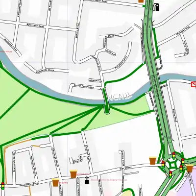 This small river in the center of [Rauma] is edged with murals. They are absolutely straight and they have sharp corners. You can also see that the bridge is centered in the editor but not in Osmarender because the river is shifted. --Plenz 07:04, 23 November 2007 (UTC)