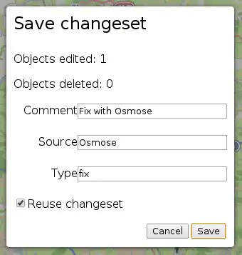 In the Save window, the changeset input fields (Comment, Source, Type) will be stored in the changeset's tags. The "Reuse changeset" checkbox allows to reuse, if possible, the last changeset that Osmose has created rather than creating a new one.