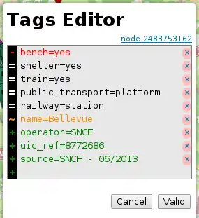 overstrikedand preceded by a − sign, the existing tags that will be removed when saving; the cross × button on the right will restore them to preserve their original value. - In black and preceded by a white = sign, the existing tags that will be kept unchanged when saving; the cross × button on the right will remove them when saving.