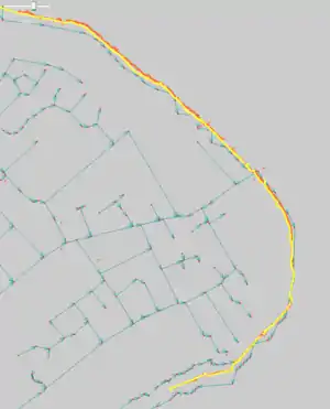 - Orange and yellow are two GPS tracks (one walked in each direction), which I tried to be as close to possible to the High water mark.