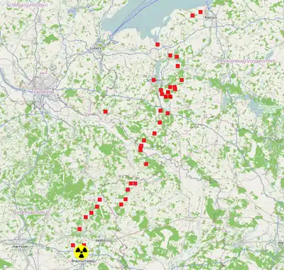 en = A citizens' initiative against nuclear waste in a residential area uses OSM and OpenLayers for the visualisation of a ballon-action. The ballon-cloud, visible in the map, symbolises the spreading of radioactivity in case of an accident.