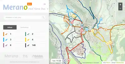 The website bus.meran.eu displays real time locations of public transport buses in the city of Meran - Merano and uses OpenStreetMap for their custom-made basemap. This could be interesting because Meran already already has some history with OSM (in 2007, they were among the first public entities to release their data as open data specifically for OSM).