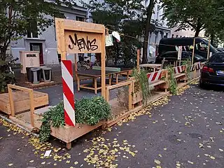 | Parklet providing seats, plants, a table tennis pitch and devices for community and neighbourhood informations. |