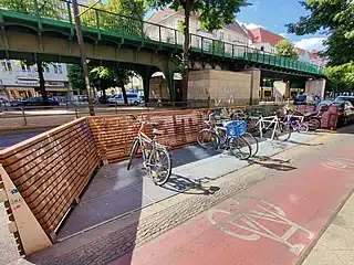 | Parklet only for bicycle parking. | Parklet with seatings and bicycle parking. | Parklet with seatings, plants and a bicycle service station. |