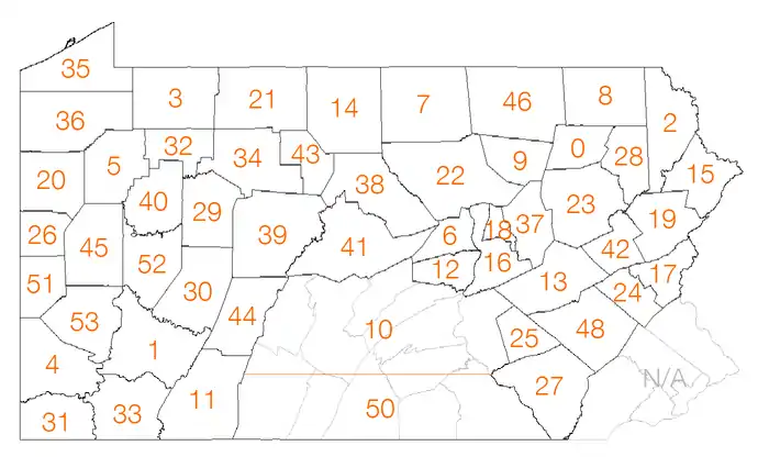 | 50 | 2003 | Southcentral PA (Adams, Cumberland, Franklin, Fulton, Huntingdon, York) south of 40.129º N | Link |