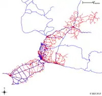 | Pois | Highways | Comparison of Arivac roads (red) and OSM (blue) |