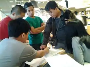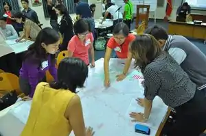 Greenhills Christmas/Mapping Party. OpenStreetMap Philippines celebrated Chirstmas the OSM way: via a Mapping Party! In this photo, participants discuss what to map and by whom during the afternoon meeting just before the field survey. | |
