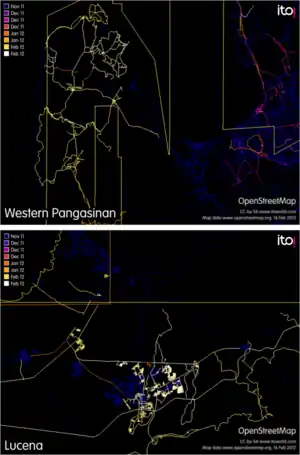 One year of edits in Metro Manila (2012). Compared to 2 years ago, the map of Metro Manila and its surrounding areas has now reached a certain level of maturity where the data is now more on adding the finer details such as buildings and POIs and on maintaining the existing data, rather than on filling in missing streets. This image shows the editing activity in 2011. Brighter areas show more recent activity. | |