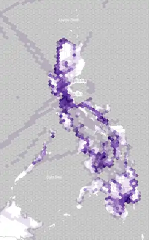 Node density in the Philippines. This is a visualization of the node density of OSM data in the Philippines taken from the 2012-01-02 extract. Each pixel represents a 0.01°×0.01° degree square or approximately 1 square kilometer. Brighter pixels represent areas with higher node counts. As expected, brighter areas are places with a large population, where there is a large amount of editing, and where there is available high-resolution imagery since there would be more features (such as buildings) that can be traced. An example in is the conurbation of Metro Manila. | |