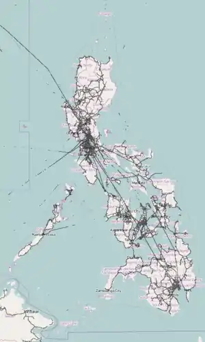 GPS data points map. This map shows the raw point map of GPS data points in and around the Philippines that have been submitted by contributors to OpenStreetMap. The major national routes and highways (as well as some airline routes) are quite visible. | |