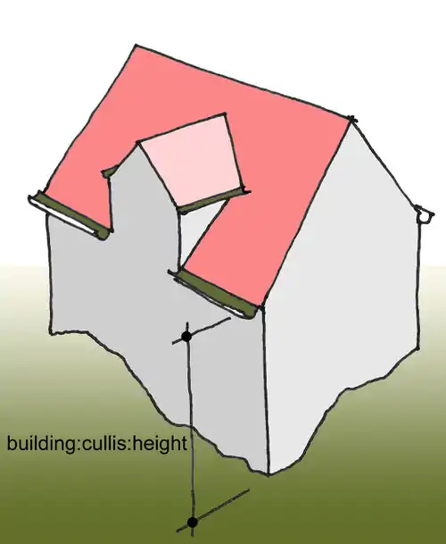 building:cullis:height=*- maksymalna, mierzona, wysokość między poziomem terenu a dolną krawędzią rynny.