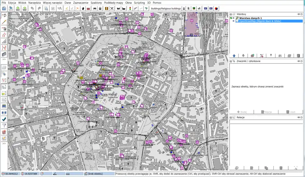 Znalezienie czegoś w danych OpenStreetMap zawsze znaczy wyszukiwanie lokalizacji lub wartości niektórych tagów. Można wybrać dowolną wartość dla znacznika w poniższych przykładach. Na początku możemy znaleźć obiekty według ich nazw, więc szukamy pewnych wartości dla klucza "name".
