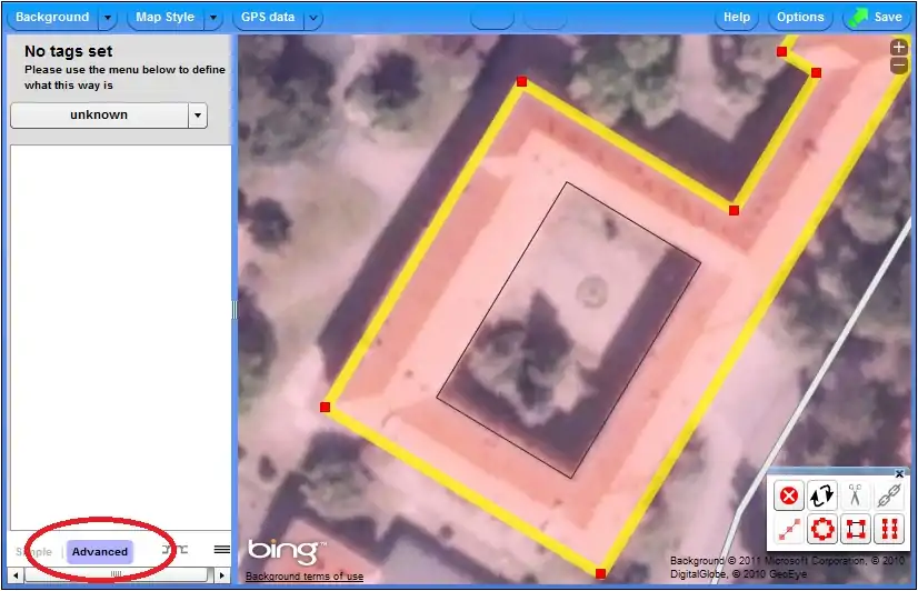 - Narysuj obrys zewnętrzny i otaguj go, np. building=yes.