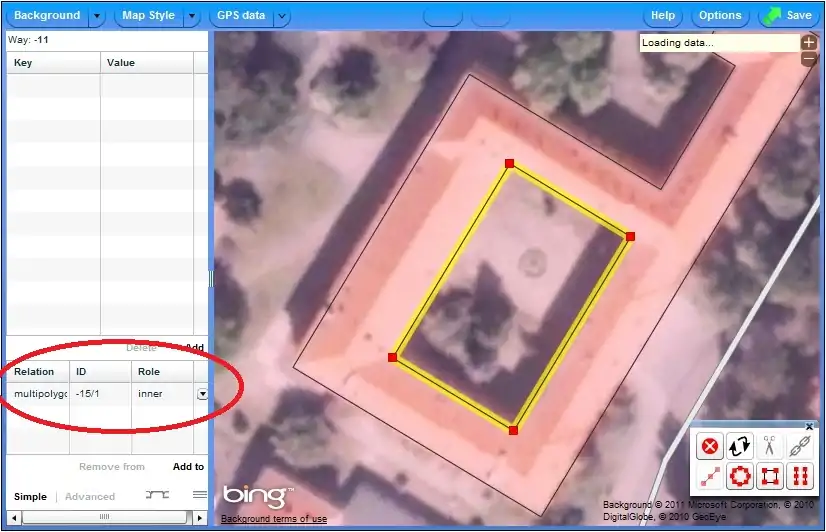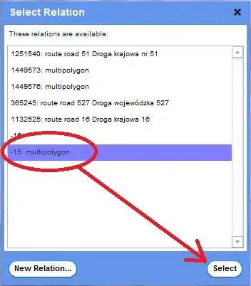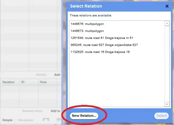 . Wybierz opcję "Add to an existing relation", wybierz stworzoną relację w menu dropdown. Powinna ona mieć najwyższy numer w licie. Kliknij na "Ok" by dodać obrys do wybranej relacji. - Powtórz krok 6 dla wewnętrznego obrysu opisanego słowem "inner".