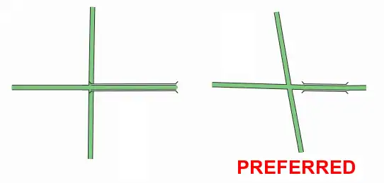 Wszystkie skrzyżowania powinien zostać wyrysowane jako węzeł, który łączy drogi (obie lub kilka, posiadających wspólny (!) węzeł).
