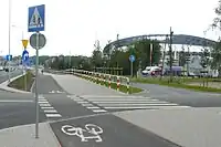 | Przejazd rowerowy przez jezdnię połączony z przejściem dla pieszych. |