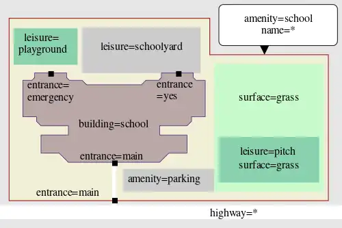 - building=school – para um edifício construído para fins escolares, como o edifício único de uma escola ou os vários blocos de aulas de um complexo.