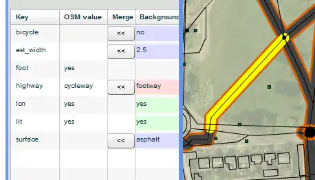 - This is a bit of a contrived example. The background data (in the England Cycling Data project) happens to have been deliberated snapped to OSM data, which is unlikely to be the general case for using the merging tool. And in any case, even in this example, the 1:1 match between the OSM data and the background data is guaranteed only for the first couple of hours after the data was created - as OSM changes, there won't be such good correlation. That's why you need to deliberately pick the background feature, then decide which of the OSM features is the relevant one, before seeing any comparison. --Gravitystorm 14:51, 8 March 2012 (UTC)