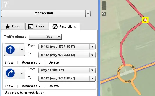 - Click the 'Restrictions' tab in the tag panel, then 'Add new turn restriction'.