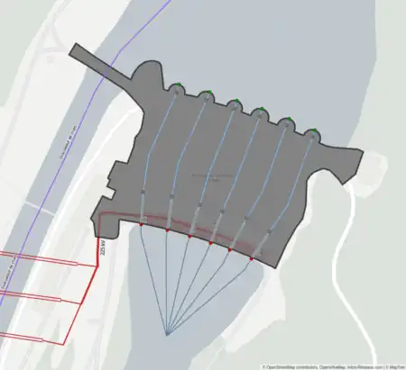 The watercourse and power equipment are mapped as to get a routable water and power networks in OSM with features: