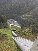 Penstocks can be visible going down hill or dug directly into mountains, often like vertical shielded shafts.