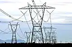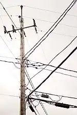 | 25 kV | Distribution | Utilisée dans la majorité du système de distribution. 3 phases | Poteaux de taille ordinaires, ou des câbles souterrains. La présence de plusieurs circuits peut ne pas être évidente sur la photographie aérienne. Les systèmes 25 et 14.4 kV sont généralement bouclés, avec de nombreuses branches monophasées ou triphasées et des connexions de secours à partir d'autres postes fournies par des sectionneurs ouverts à l'extrémité des départs. | ![]() |